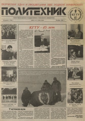 Политехник : газета/ Краснояр. политех. ин-т. - Красноярск : КГТУ, 1964 - - 2006 2001г. N 14/15 (1054-1055) (Октябрь) Отсутствуют стр. 3-4.http://lib3.sfu-kras.ru/ft/LIB2/ELIB_DC/SFUPRSV/sfupol/2001/2001_10_ _1054-1055.pdf