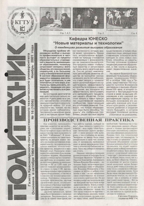 Политехник : газета/ Краснояр. политех. ин-т. - Красноярск : КГТУ, 1964 - - 2006 2001г. N 16 (1056) (Ноябрь) http://lib3.sfu-kras.ru/ft/LIB2/ELIB_DC/SFUPRSV/sfupol/2001/2001_11_ _1056.pdf