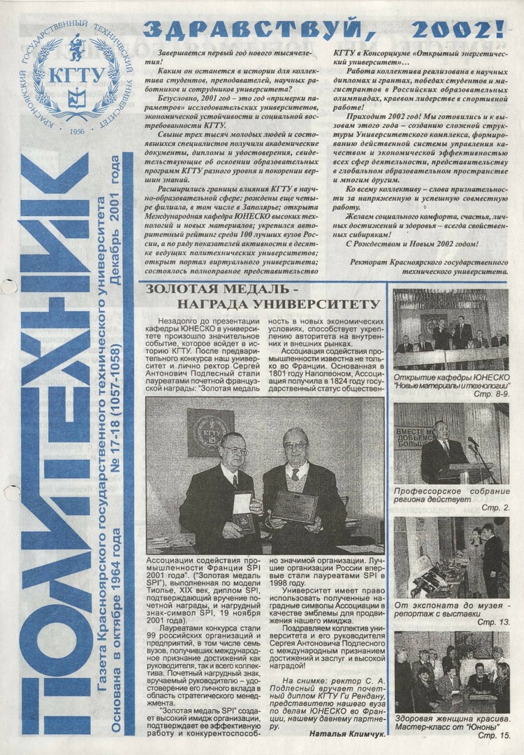 Политехник : газета/ Краснояр. политех. ин-т. - Красноярск : КГТУ, 1964 - - 2006 2001г. N 17/18 (1057-1058) (Декабрь) http://lib3.sfu-kras.ru/ft/LIB2/ELIB_DC/SFUPRSV/sfupol/2001/2001_12_ _1057-1058.pdf