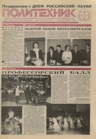 Политехник : газета/ Краснояр. политех. ин-т. - Красноярск : КГТУ, 1964 - - 2006 2003г. N 1/2 (1076-1077) (Февраль) http://lib3.sfu-kras.ru/ft/LIB2/ELIB_DC/SFUPRSV/sfupol/2003/2003_02_ _1076-1077.pdf