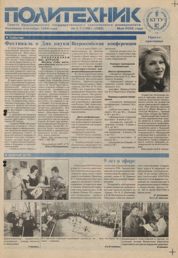 Политехник : газета/ Краснояр. политех. ин-т. - Красноярск : КГТУ, 1964 - - 2006 2003г. N 6/7 (1081-1082) (Май) http://lib3.sfu-kras.ru/ft/LIB2/ELIB_DC/SFUPRSV/sfupol/2003/2003_05_ _1081-1082.pdf
