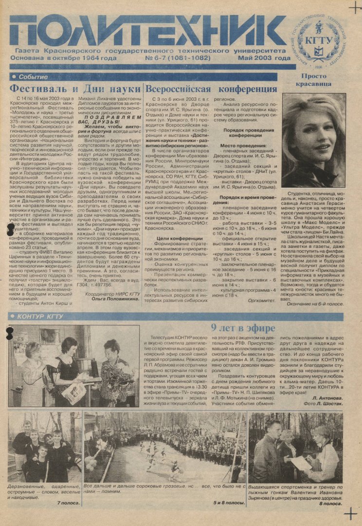 Политехник : газета. 2003 г. № 6/7 (1081-1082) (Май)
