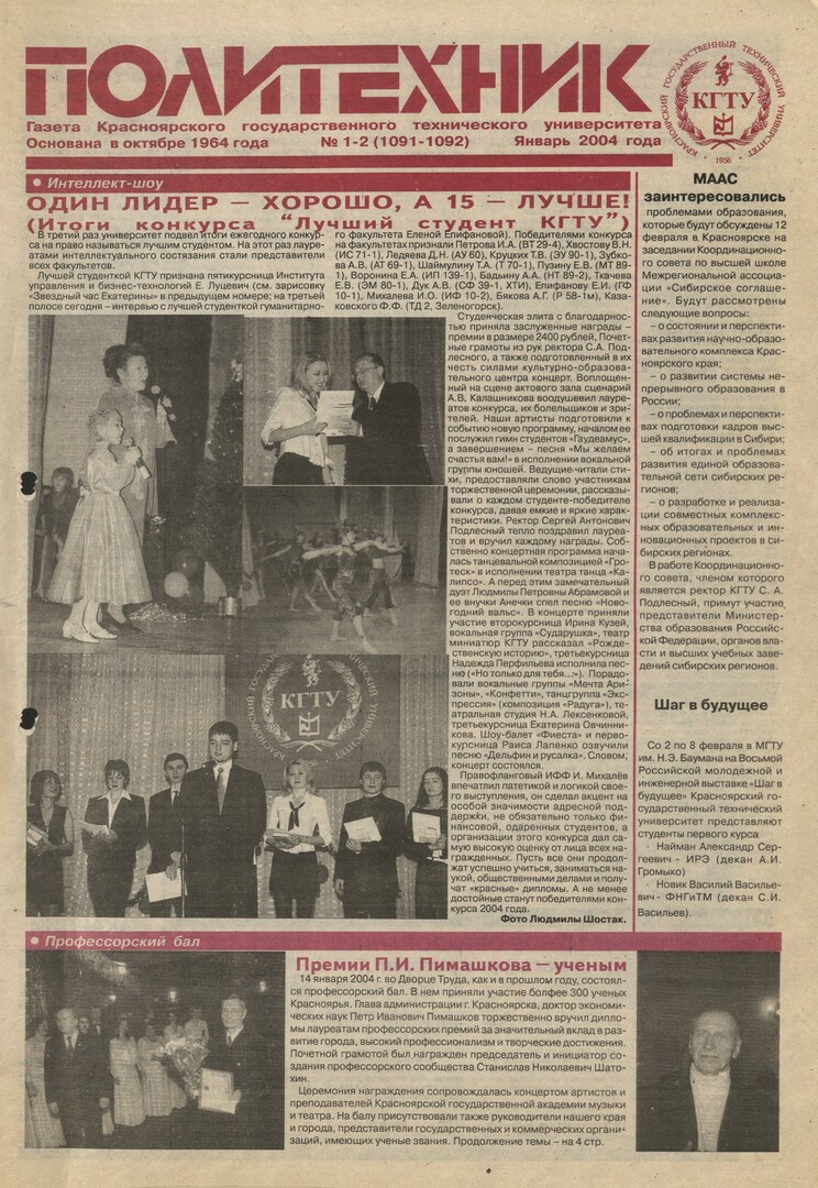 Политехник : газета/ Краснояр. политех. ин-т. - Красноярск : КГТУ, 1964 - - 2006 2004г. N 1/2 (1091-1092) (Январь) http://lib3.sfu-kras.ru/ft/LIB2/ELIB_DC/SFUPRSV/sfupol/2004/2004_01_ _1091-1092.pdf