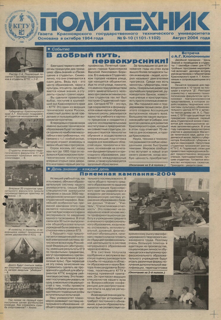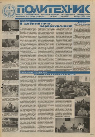 Политехник : газета/ Краснояр. политех. ин-т. - Красноярск : КГТУ, 1964 - - 2006 2004г. N 9/10 (1101-1102) (Август) http://lib3.sfu-kras.ru/ft/LIB2/ELIB_DC/SFUPRSV/sfupol/2004/2004_08_ _1101-1102.pdf
