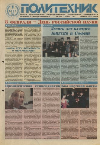 Политехник : газета/ Краснояр. политех. ин-т. - Красноярск : КГТУ, 1964 - - 2006 2005г. N 1/2 (1109-1110) (Январь) http://lib3.sfu-kras.ru/ft/LIB2/ELIB_DC/SFUPRSV/sfupol/2005/2005_01_ _1109-1110.pdf