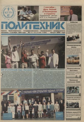 Политехник : газета/ Краснояр. политех. ин-т. - Красноярск : КГТУ, 1964 - - 2006 2005г. N 11/12 (1119-1120) (Август) http://lib3.sfu-kras.ru/ft/LIB2/ELIB_DC/SFUPRSV/sfupol/2005/2005_08_ _1119-1120.pdf