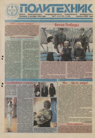 Политехник : газета/ Краснояр. политех. ин-т. - Красноярск : КГТУ, 1964 - - 2006 2005г. N 7/8 (1115-1116) (Апрель) http://lib3.sfu-kras.ru/ft/LIB2/ELIB_DC/SFUPRSV/sfupol/2005/2005_04_ _1115-1116.pdf