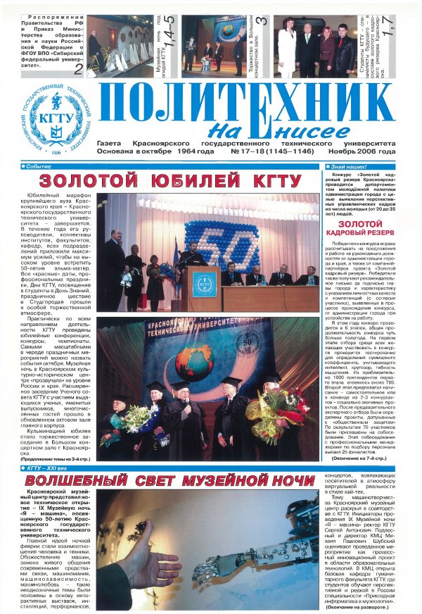 Политехник : газета/ Краснояр. политех. ин-т. - Красноярск : КГТУ, 1964 - - 2006 2006г. N 17/18 (1145-1146) (Ноябрь) http://lib3.sfu-kras.ru/ft/LIB2/ELIB_DC/SFUPRSV/sfupol/2006/2006_11_ _1145-1146.pdf