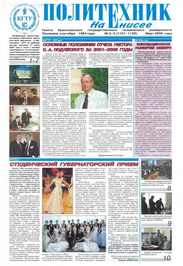 Политехник : газета/ Краснояр. политех. ин-т. - Красноярск : КГТУ, 1964 - - 2006 2006г. N 3/4/5 (1131-1133) (Март) http://lib3.sfu-kras.ru/ft/LIB2/ELIB_DC/SFUPRSV/sfupol/2006/2006_03_ _1131-1133.pdf