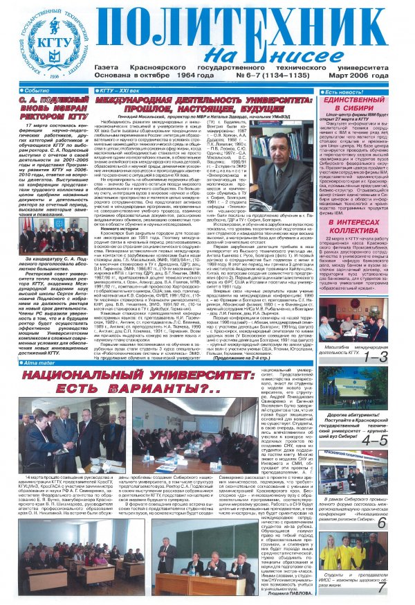 Политехник : газета/ Краснояр. политех. ин-т. - Красноярск : КГТУ, 1964 - - 2006 2006г. N 6/7 (1134-1135) (Март) http://lib3.sfu-kras.ru/ft/LIB2/ELIB_DC/SFUPRSV/sfupol/2006/2006_03_ _1134-1135.pdf