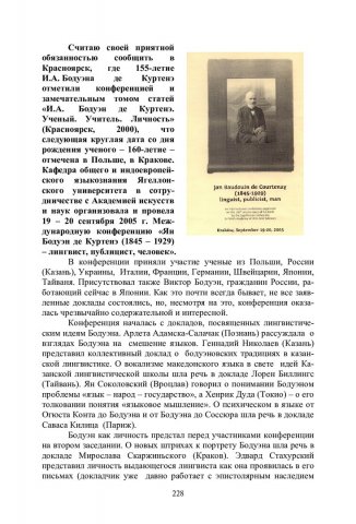 Библиографическое описание:Бялокозович, Базылий. [Информация о международной конференции "Ян Бодуэн де Куртенэ (1845-1929) - лингвист, публицист, человек", 19-20 сентября 2005 г.] / Б. Бялокозович. - Текст : непосредственный // Российский лингвистический ежегодник. - 2006. - Вып. 1 (8). - С. 228-231. - ISSN 1817-1222.
