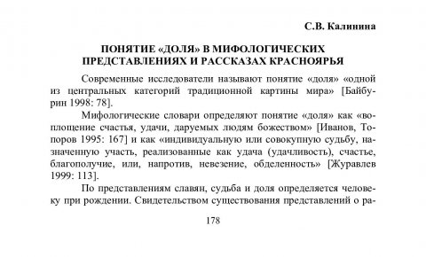 Библиографическое описание:Калинина, Светлана Валентиновна. Понятие "доля" в мифологических представлениях и рассказах Красноярья / С. В. Калинина. - Текст : непосредственный // Российский лингвистический ежегодник. - 2006. - Вып. 1 (8). - С. 178-185. - Библиогр. в конце ст. - ISSN 1817-1222.