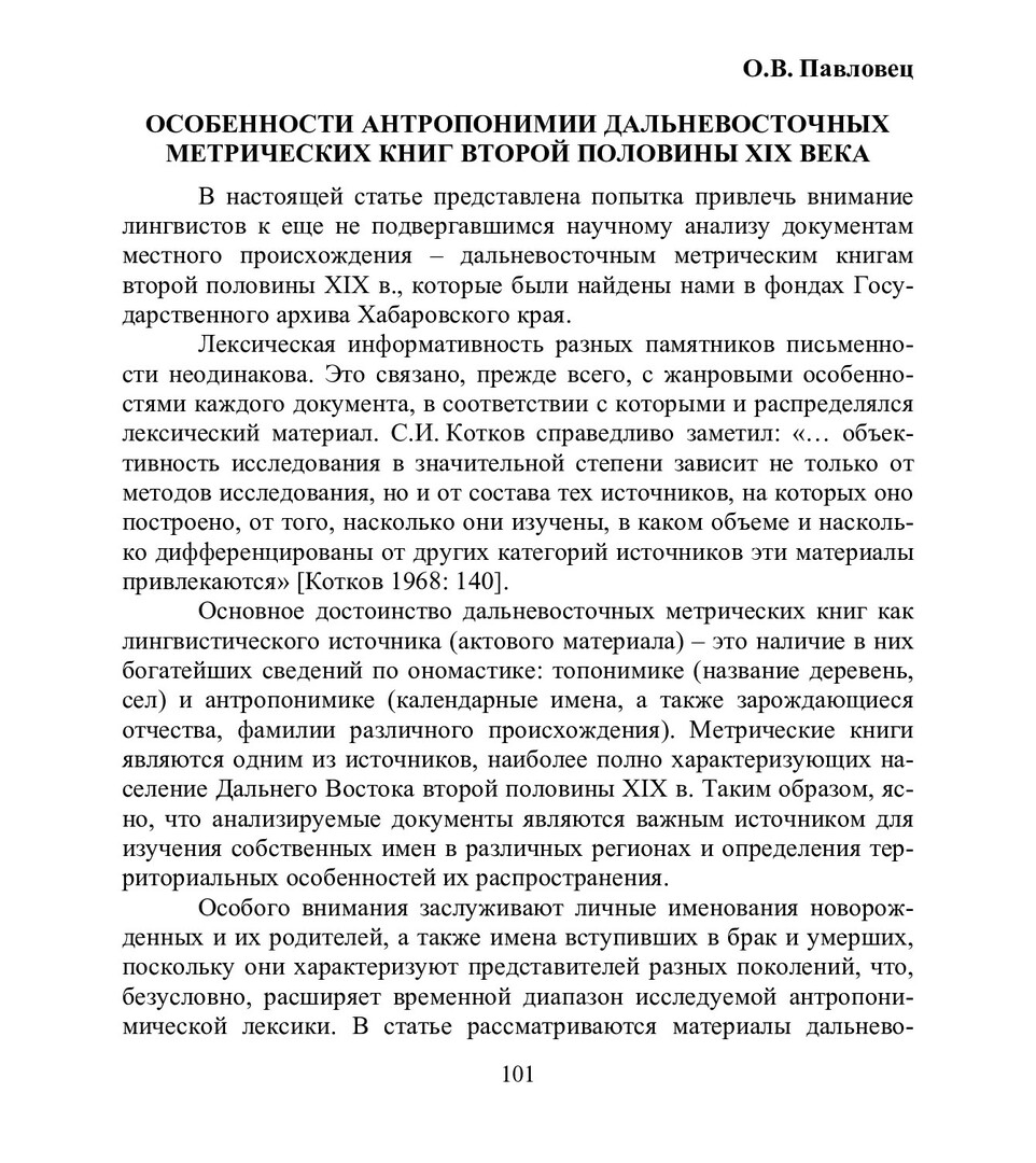 Библиографическое описание:Павловец, Ольга Владимировна. Особенности антропонимии дальневосточных метрических книг второй половины XIX века / О. В. Павловец. - Текст : непосредственный // Российский лингвистический ежегодник. - 2006. - Вып. 1 (8). - С. 101-105. - Библиогр. в конце ст. - ISSN 1817-1222.