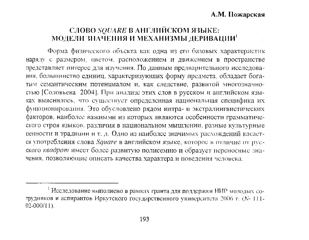 Библиографическое описание:Пожарская, Александра Михайловна. Слово SQUARE в английском языке: модели значения и механизмы деривации / А. М. Пожарская. - Текст : непосредственный // Российский лингвистический ежегодник. - 2007. - Вып. 2 (9). - С. 193-200. - Библиогр. в конце ст. - ISSN 1817-1222.