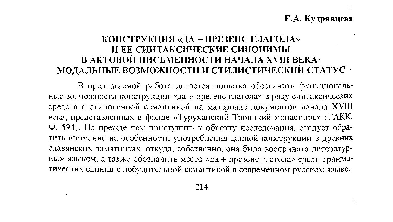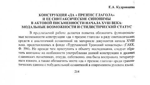 Библиографическое описание:Кудрявцева, Екатерина Александровна. Конструкция "ДА + презенс глагола" и ее синтаксические синонимы в актовой письменности начала XVIII века: модальные возможности и стилистический статус / Е. А. Кудрявцева. - Текст : непосредственный // Российский лингвистический ежегодник. - 2007. - Вып. 2 (9). - С. 214-219. - Библиогр. в конце ст. - ISSN 1817-1222.
