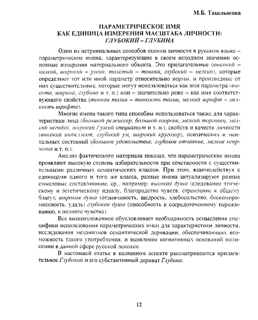 Библиографическое описание:Ташлыкова, Марина Борисовна. Параметрическое имя как единица измерения масштаба личности: ГЛУБОКИЙ - ГЛУБИНА / М. Б. Ташлыкова. - Текст : непосредственный // Российский лингвистический ежегодник. - 2007. - Вып. 2 (9). - С. 12-22. - Библиогр. в конце ст. - ISSN 1817-1222.