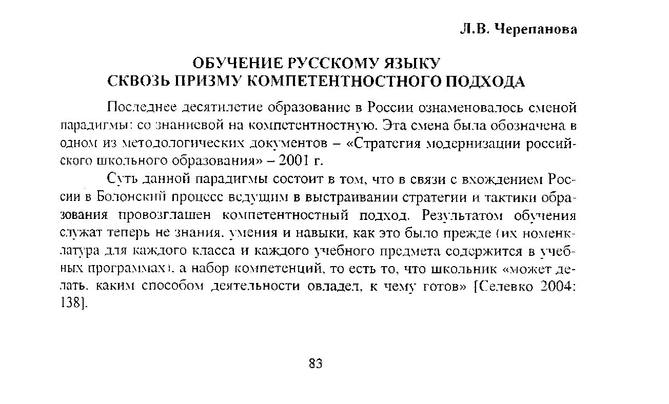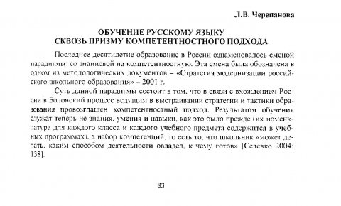 Библиографическое описание:Черепанова, Лариса Витальевна. Обучение русскому языку сквозь призму компетентностного подхода / Л. В. Черепанова. - Текст : непосредственный // Российский лингвистический ежегодник. - 2007. - Вып. 2 (9). - С. 83-91. - Библиогр. в конце ст. - ISSN 1817-1222.