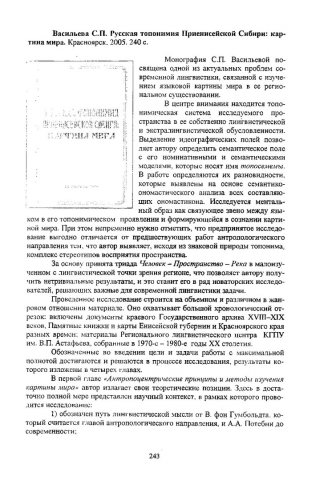 Библиографическое описание:Григорьева, Татьяна Михайловна. [Рецензия] / Т. М. Григорьева. - Текст : непосредственный // Российский лингвистический ежегодник. - 2007. - Вып. 2 (9). - С. 243-246. - Рец. на кн.: Русская топонимия Приенисейской Сибири: картина мира / С. П. Васильева. Красноярск, 2005. 240 с. - ISSN 1817-1222.