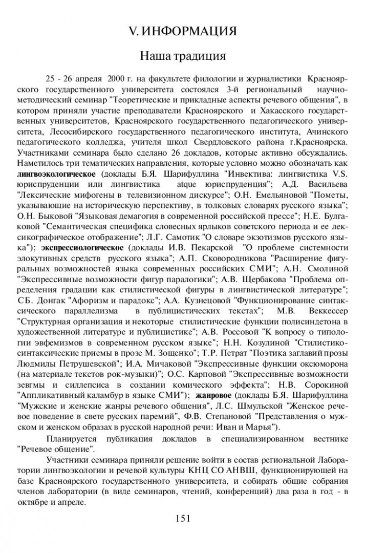 Сковородников, Александр Петрович. Наша традиция : [о 3-ем региональном научно-методическом семинаре "Теоретические и прикладные аспекты речевого общения"] / А. П. Сковородников. - Текст : непосредственный // Речевое общение. - 2000. - Вып. 2 (10). - С. 151-152. - ISSN 1682-3923.
