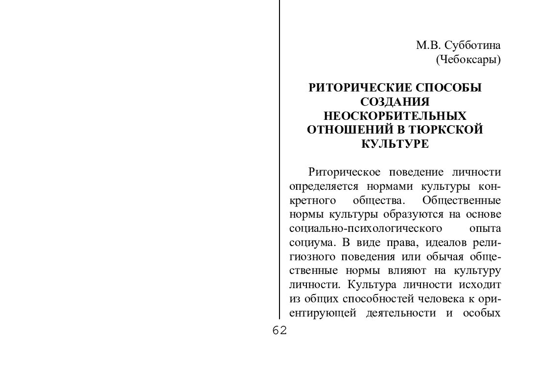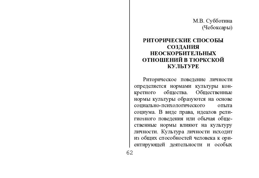 Библиографическое описание:Субботина, М. В. Риторические способы создания неоскорбительных отношений в тюркской культуре / М. В. Субботина. - Текст : непосредственный // Речевое общение. - 2000. - Вып. 2 (10). - С. 62-66. - Библиогр. в конце ст. - ISSN 1682-3923.