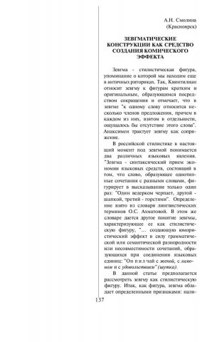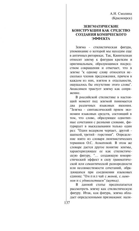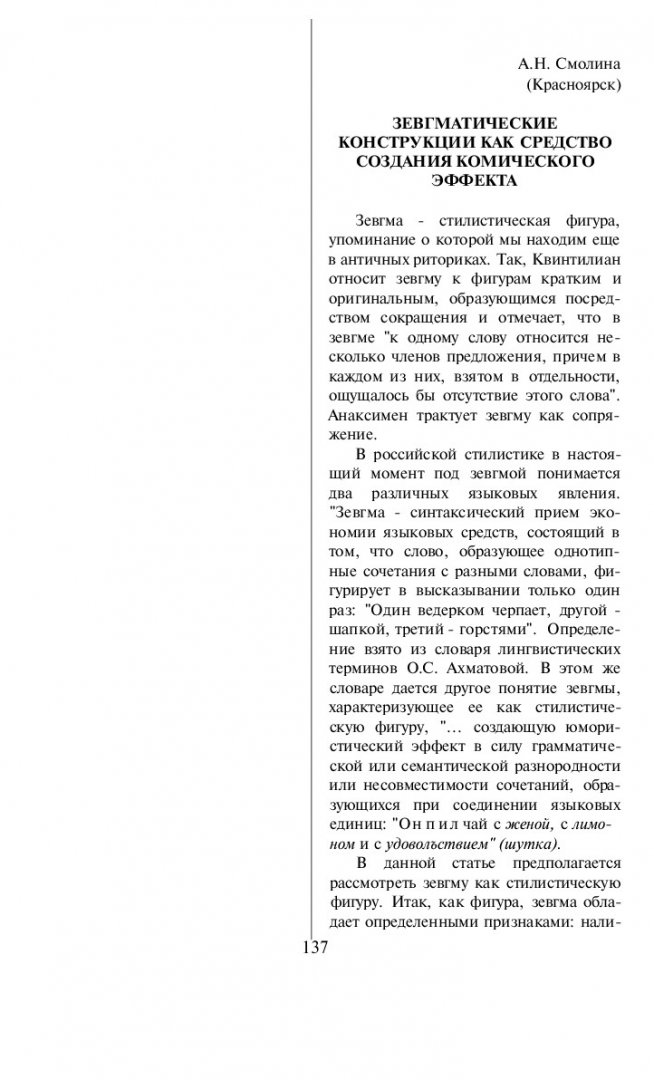 Библиографическое описание:Смолина, Анджелла Николаевна. Зевгматические конструкции как средство создания комического эффекта / А. Н. Смолина. - Текст : непосредственный // Речевое общение. - 2000. - Вып. 2 (10). - С. 137-141. - Библиогр. в конце ст. - ISSN 1682-3923.