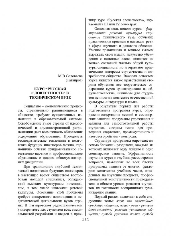 Соловьева, М. В. Курс "Русская словесность" в техническом вузе / М. В. Соловьева. - Текст : непосредственный // Речевое общение. - 2000. - Вып. 2 (10). - С. 115-118. - ISSN 1682-3923.