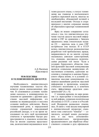 Васильев, А. Д. Рефлексивы в телевизионном дискурсе / А. Д. Васильев. - Текст : непосредственный // Речевое общение. - 2000. - Вып. 3 (11). - С. 28-36. - Библиогр. в конце ст. - ISSN 1682-3923.