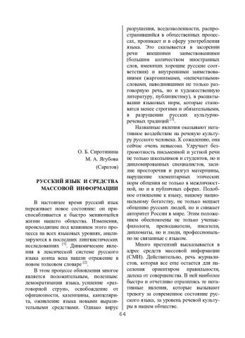Сиротинина, О. Б. Русский язык и средства массовой информации / О. Б. Сиротинина, М. А. Якубова. - Текст : непосредственный // Речевое общение. - 2000. - Вып. 3 (11). - С. 64-70. - Библиогр. в конце ст. - ISSN 1682-3923.