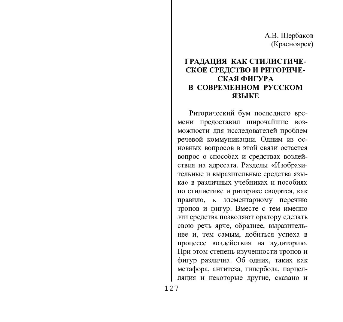 Библиографическое описание:Щербаков, А. В. Градация как стилистическое средство и риторическая фигура в современном русском языке / А. В. Щербаков. - Текст : непосредственный // Речевое общение. - 2000. - Вып. 3 (11). - С. 127-132. - Библиогр. в конце ст. - ISSN 1682-3923.