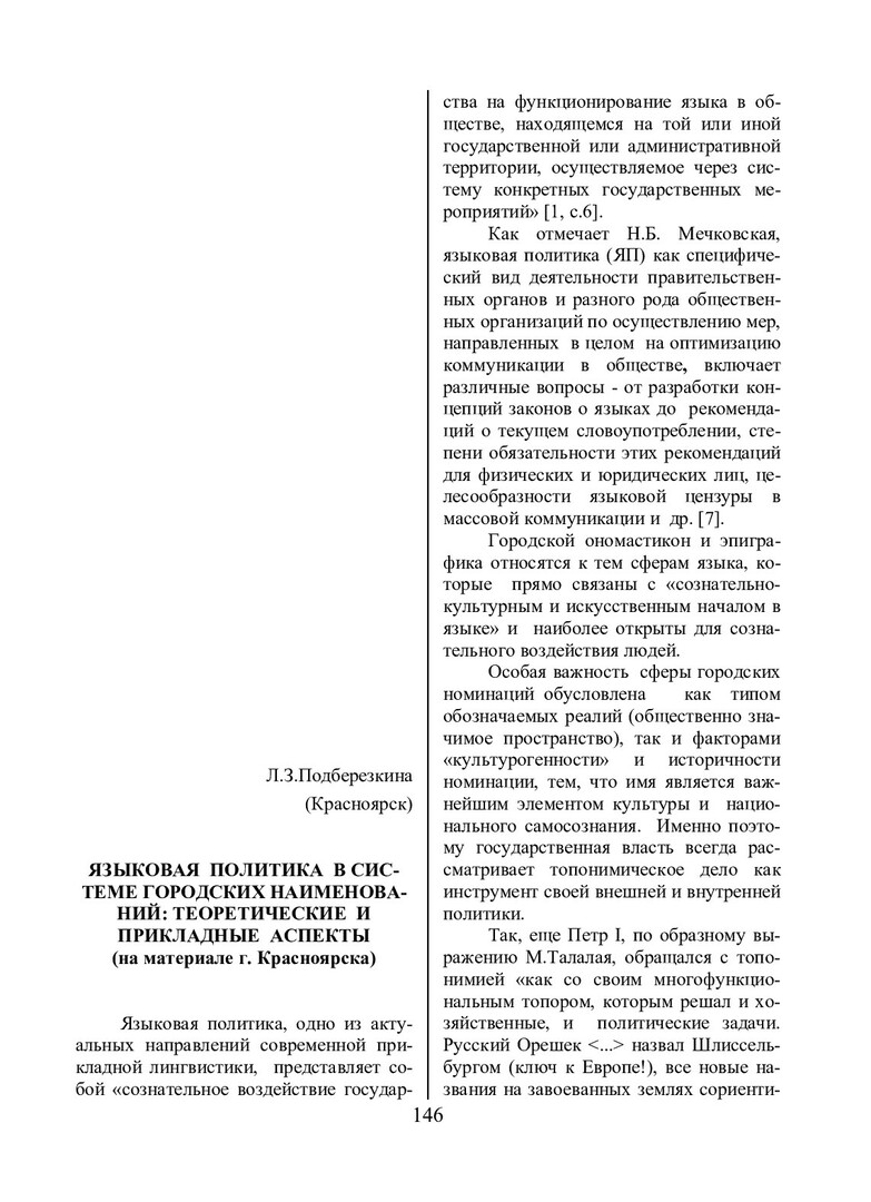 Библиографическое описание:Подберезкина, Л. З. Языковая политика в системе городских наименований: теоретические и прикладные аспекты (на материале г. Красноярска) / Л. З. Подберезкина. - Текст : непосредственный // Речевое общение. - 2002. - Вып. 4 (12). - С. 146-154. - Библиогр. в конце ст. - ISSN 1682-3923.