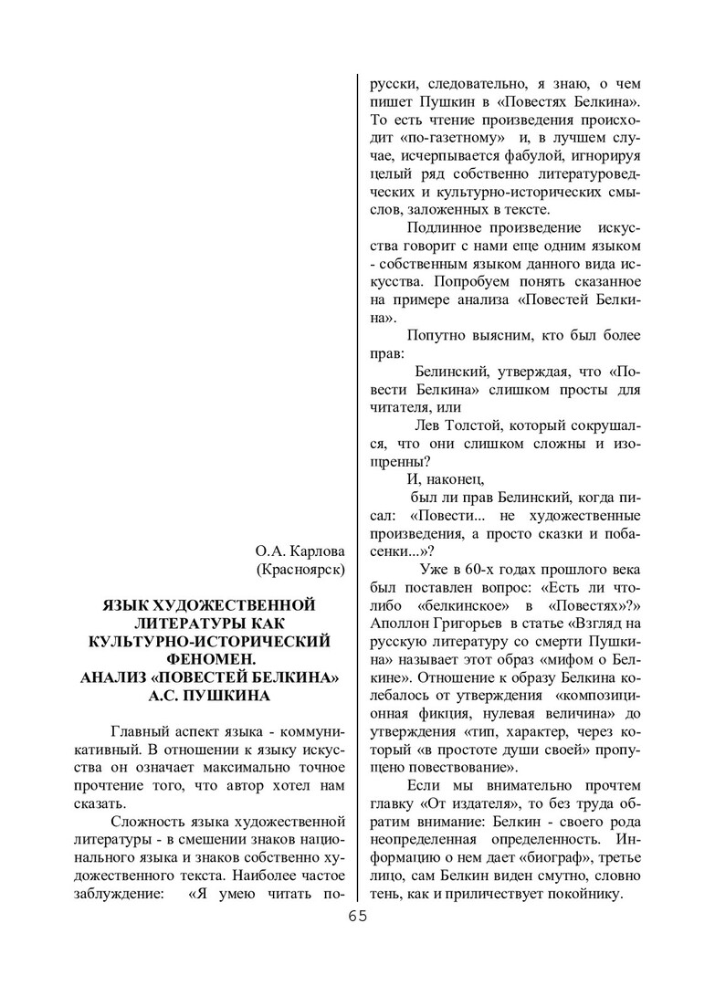Библиографическое описание:Карлова, О. А. Язык художественной литературы как культурно-исторический феномен. Анализ "Повестей Белкина" А. С. Пушкина / О. А. Карлова. - Текст : непосредственный // Речевое общение. - 2002. - Вып. 4 (12). - С. 65-70. - ISSN 1682-3923.