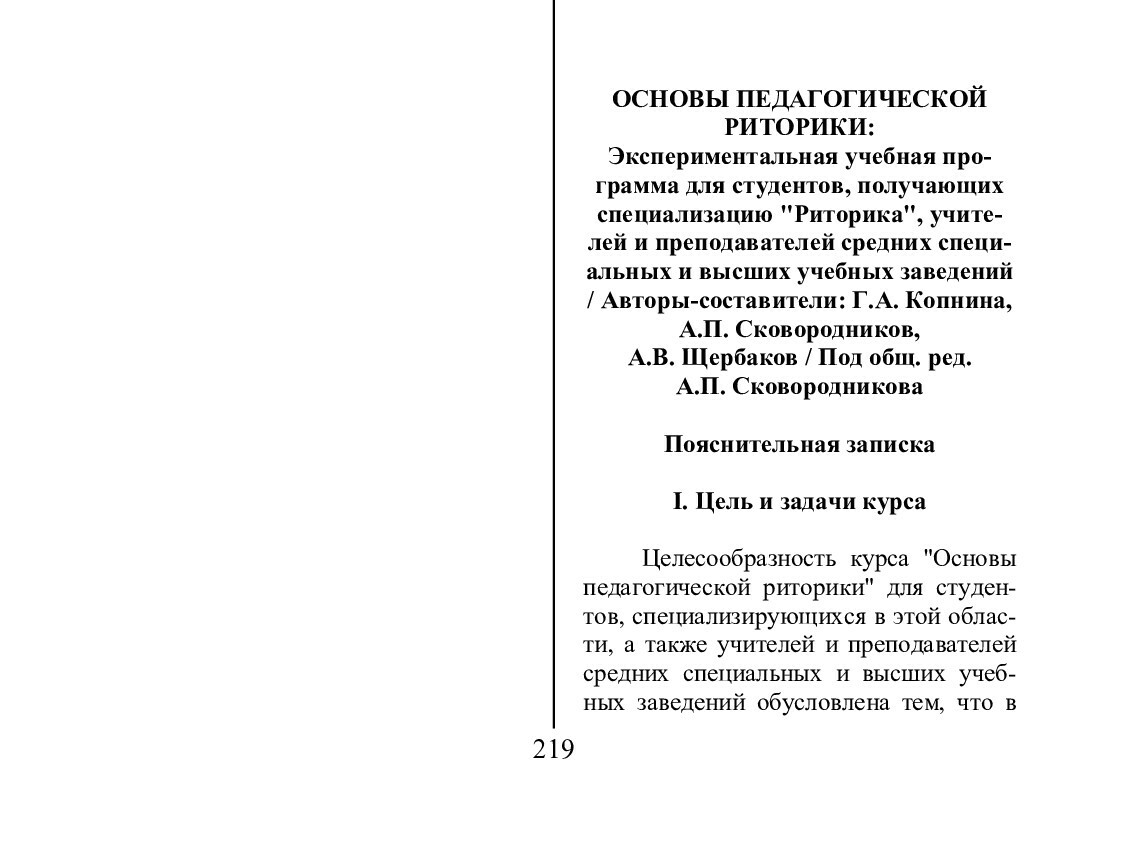 Основы педагогической риторики : экспериментальная учебная программа для студентов, получающих специализацию "Риторика", учителей и преподавателей средних специальных и высших учебных заведений
