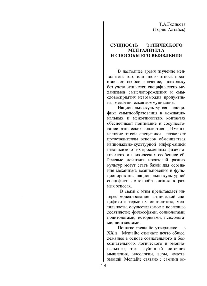 Голикова, Т. А. Сущность этнического менталитета и способы его выявления / Т. А. Голикова. - Текст : непосредственный // Речевое общение. - 2002. - Вып. 4 (12). - С. 14-18. - Библиогр. в конце ст. - ISSN 1682-3923.