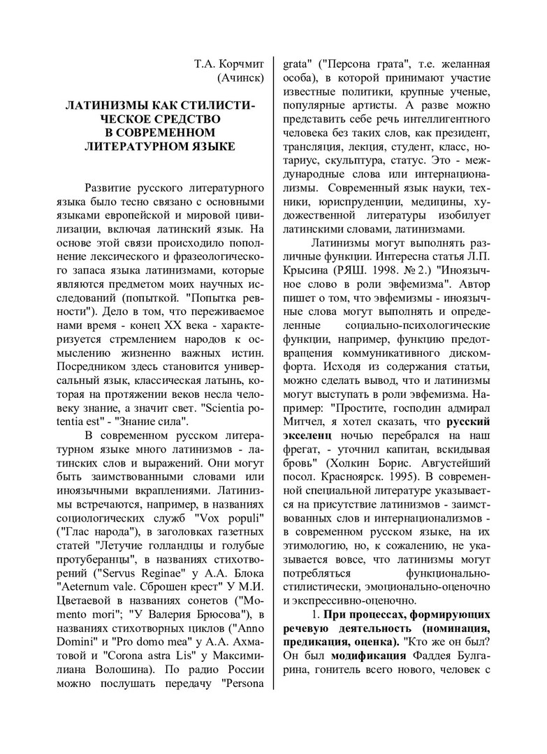 Корчмит, Т. А. Латинизмы как стилистическое средство в современном литературном языке / Т. А. Корчмит. - Текст : непосредственный // Речевое общение. - 2002. - Вып. 4 (12). - С. 19-23. - ISSN 1682-3923.
