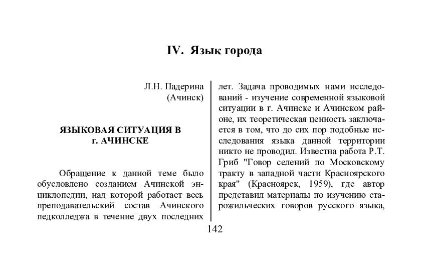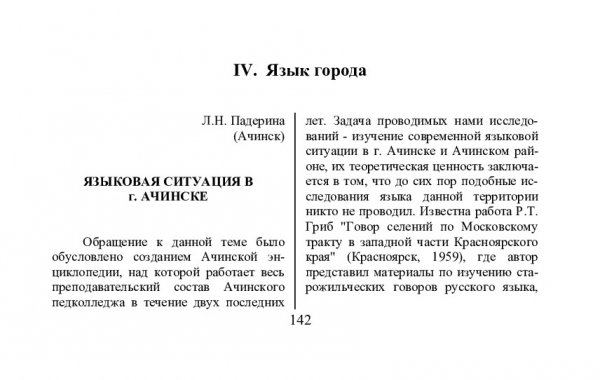 Падерина, Л. Н. Языковая ситуация в г. Ачинске / Л. Н. Падерина. - Текст : непосредственный // Речевое общение. - 2002. - Вып. 4 (12). - С. 142-146. - Библиогр. в конце ст. - ISSN 1682-3923.