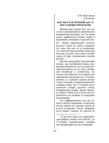 Береговская, Э. М. Bon mot как речевой акт: к постановке проблемы / Э. М. Береговская. - Текст : непосредственный // Речевое общение. - 2004. - Вып. 5/6 (13-14). - С. 116-122. - Библиогр. в конце ст. - ISSN 1682-3923.