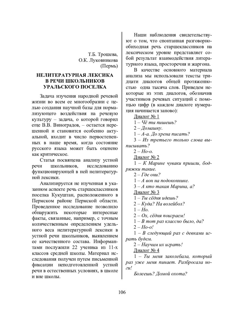 Трошева, Т. Б. Нелитературная лексика в речи школьников уральского поселка / Т. Б. Трошева, О. К. Луковникова. - Текст : непосредственный // Речевое общение. - 2004. - Вып. 5/6 (13-14). - С. 106-110. - ISSN 1682-3923.