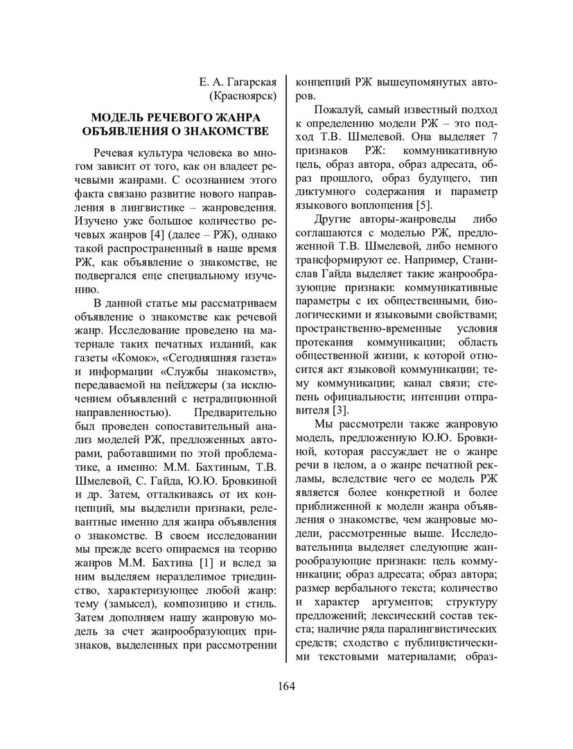 Гагарская, Е. А. Модель речевого жанра объявления о знакомстве / Е. А. Гагарская. - Текст : непосредственный // Речевое общение. - 2004. - Вып. 5/6 (13-14). - С. 164-168. - Библиогр. в конце ст. - ISSN 1682-3923.