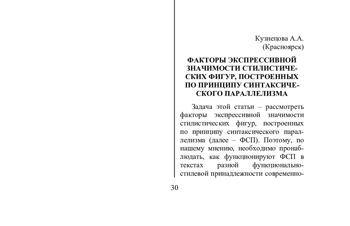 Кузнецова, А. А. Факторы экспрессивной значимости стилистических фигур, построенных по принципу синтаксического параллелизма / А. А. Кузнецова. - Текст : непосредственный // Речевое общение. - 2004. - Вып. 5/6 (13-14). - С. 30-36. - ISSN 1682-3923.