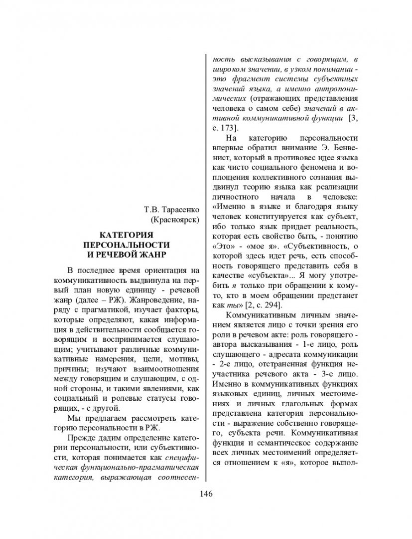 Тарасенко, Татьяна Васильевна. Категория персональности и речевой жанр / Т. В. Тарасенко. - Текст : непосредственный // Речевое общение. - 2004. - Вып. 5/6 (13-14). - С. 146-150. - Библиогр. в конце ст. - ISSN 1682-3923.