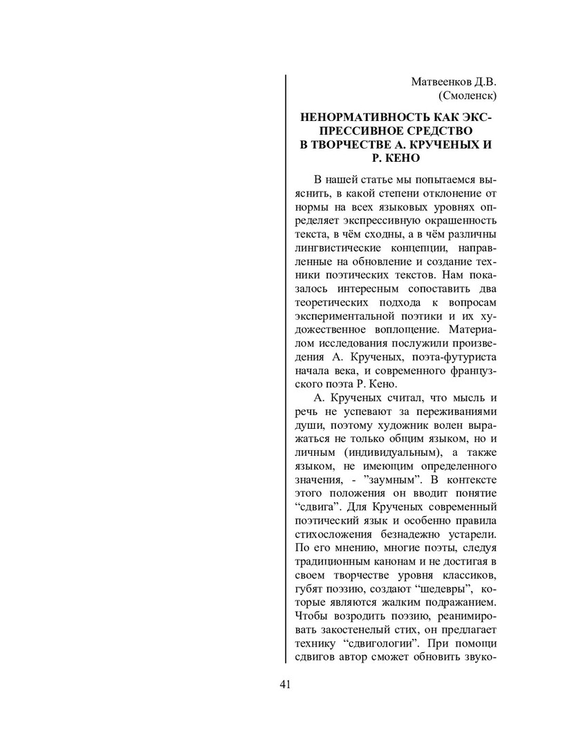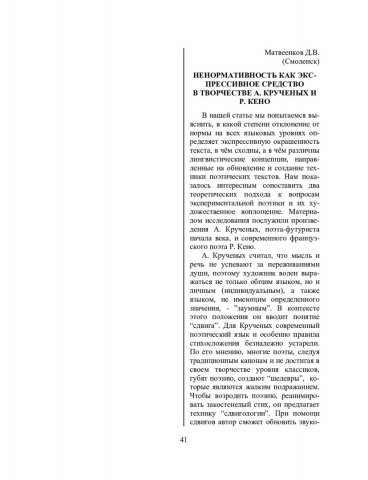 Библиографическое описание:Матвеенков, Д. В. Ненормативность как экспрессивное средство в творчестве А. Крученых и Р. Кено / Д. В. Матвеенков. - Текст : непосредственный // Речевое общение. - 2004. - Вып. 5/6 (13-14). - С. 41-45. - Библиогр. в конце ст. - ISSN 1682-3923.