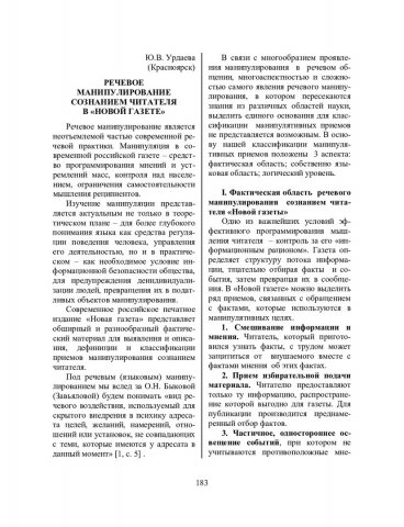 Урдаева, Ю. В. Речевое манипулирование сознанием читателя в "Новой газете" / Ю. В. Урдаева. - Текст : непосредственный // Речевое общение. - 2004. - Вып. 5/6 (13-14). - С. 183-189. - Библиогр. в конце ст. - ISSN 1682-3923.