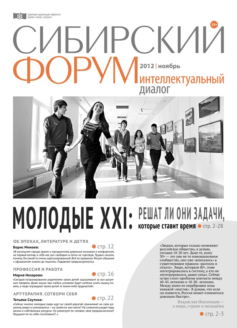 Сибирский форум. Интеллектуальный диалог : газета/ учред. Сиб. федер. ун-т. - Красноярск, 2009 - - 2022. - ISSN 2222-5552. - Выходит ежемесячно 2012г. Ноябрь (№ 7 (25), 27 ноября) Полный текст ( 7.9 Мб; PDF). Ресурс свободного доступа