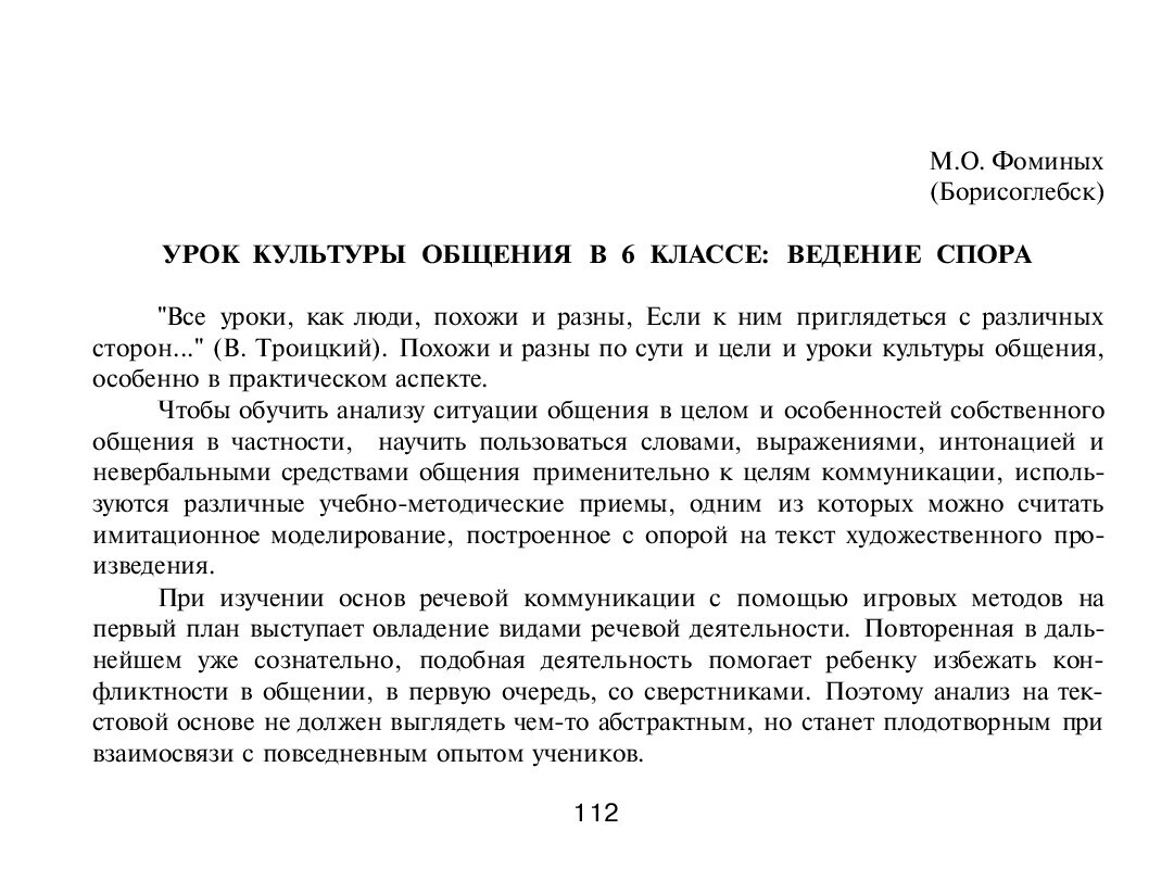 Фоминых, М. О. Урок культуры общения в 6 классе: ведение спора / М. О. Фоминых. - Текст : непосредственный // Теоретические и прикладные аспекты речевого общения. - 1998. - Вып. 3 (7). - С. 112-115.