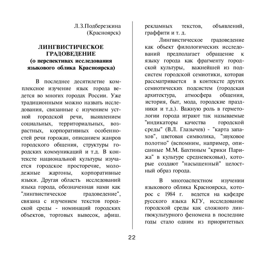 Библиографическое описание:Подберезкина, Лилия Зуфаровна. Лингвистическое градоведение (о перспективах исследования языкового облика Красноярска) / Л. З. Подберезкина. - Текст : непосредственный // Теоретические и прикладные аспекты речевого общения. - 1998. - Вып. 6. - С. 22-30. - Библиогр. в конце ст.