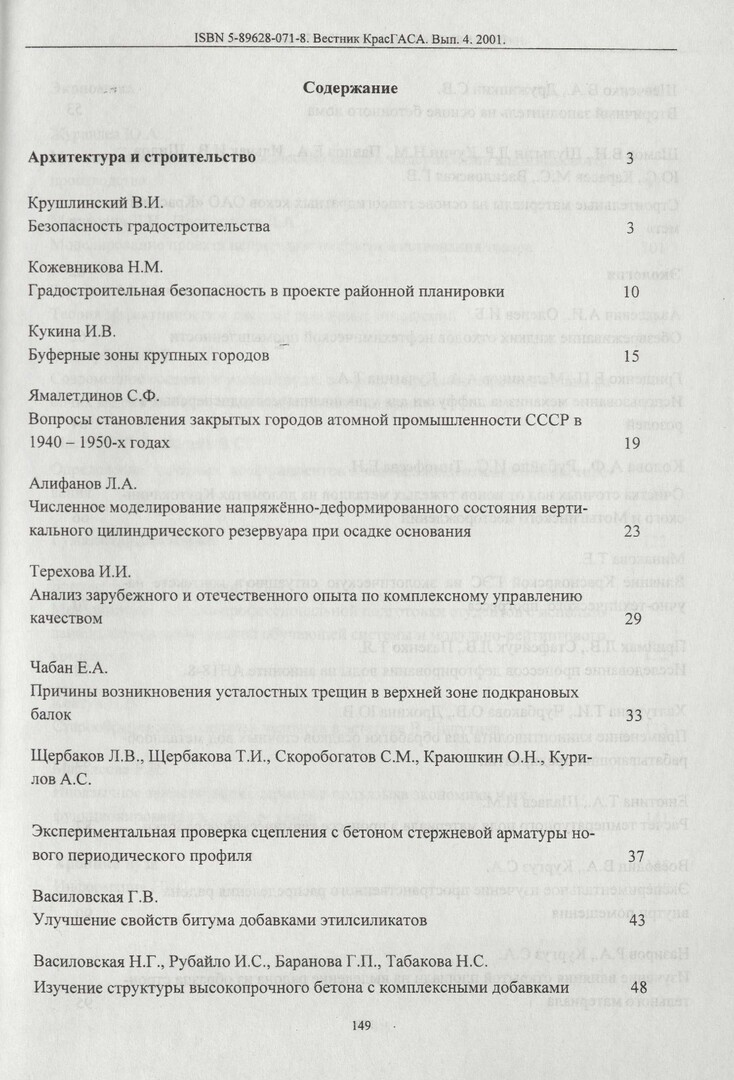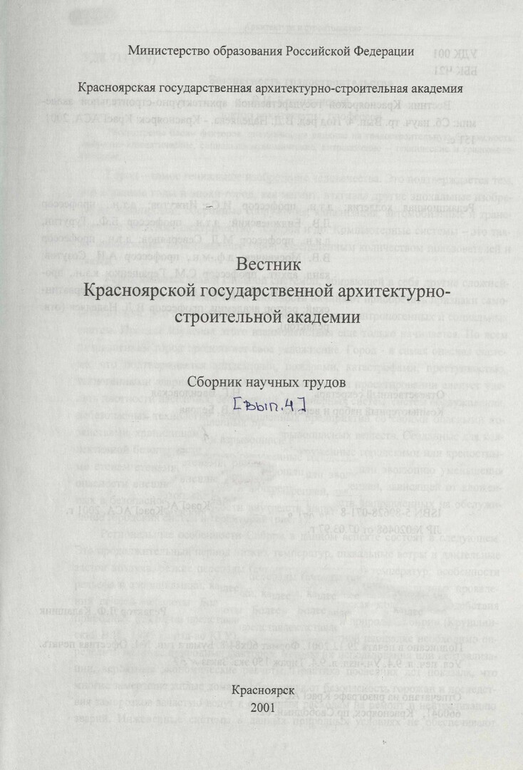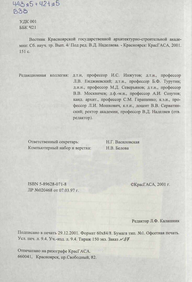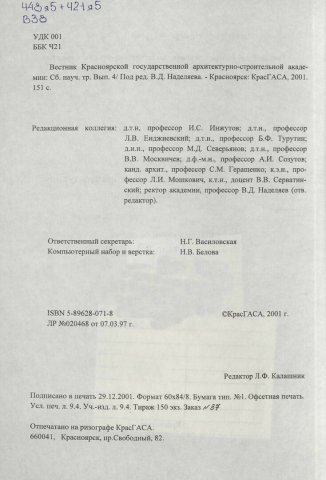 Библиографическое описание:Вестник Красноярской государственной архитектурно-строительной академии : сб. науч. трудов/ отв. ред. В. Д. Наделяев . - Красноярск : КрасГАСА, 1999 - - 2006 2001г. Вып. 4