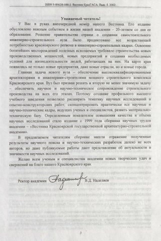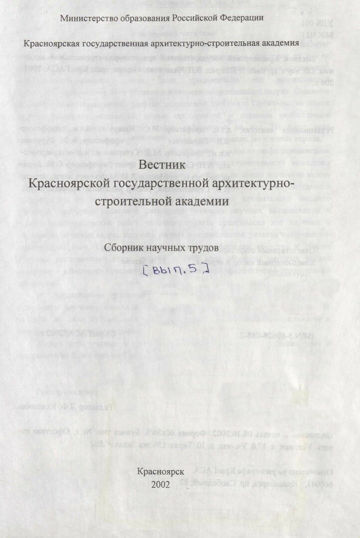 Библиографическое описание:Вестник Красноярской государственной архитектурно-строительной академии : сб. науч. трудов/ отв. ред. В. Д. Наделяев . - Красноярск : КрасГАСА, 1999 - - 2006 2002г. Вып. 5