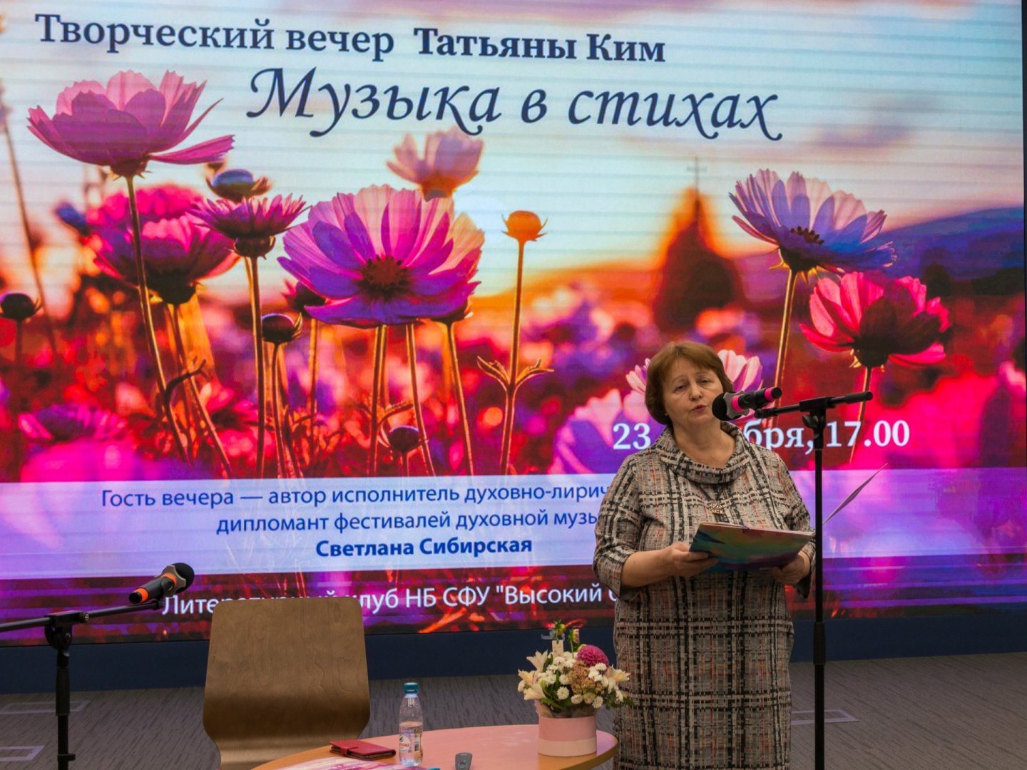 23 октября в литературном клубе «Высокий берег» состоялась презентация литературно-музыкального сборника «Музыка в стихах». Татьяна Алексеевна Ким, доцент кафедры физики Института инженерной физики и радиоэлектроники СФУ, лично провела встречу и прочитала свои стихи.