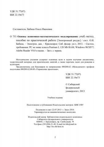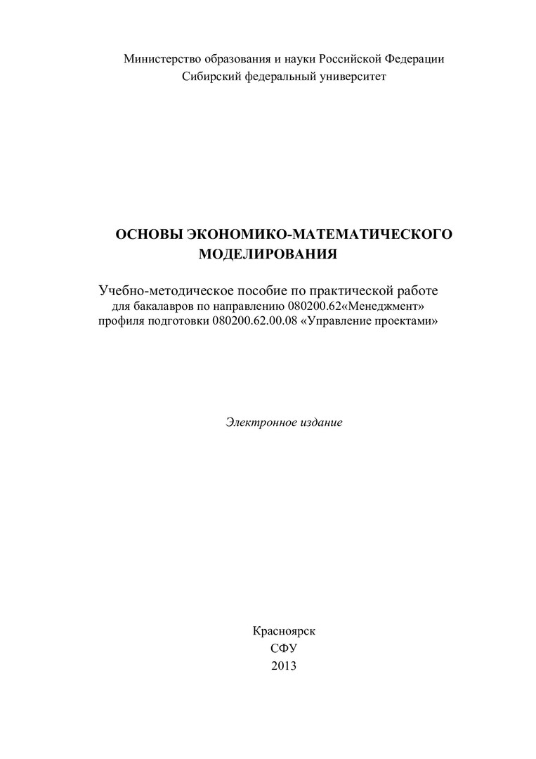 Библиографическое описание:Основы экономико-математического моделирования : учеб.-метод. пособие для практич. работы [для студентов напр. 080200.62 «Менеджмент» профиля подг. 080200.62.00.08 «Управление проектами»] / Сиб. федерал. ун-т ; сост. О. И. Бабина. - Электрон. текстовые дан. (PDF, 299 Кб). - Красноярск : СФУ, 2013. - Загл. с титул. экрана. - Библиогр.: с. 27. - Изд. № 2013-2810. - Текст : непосредственный.