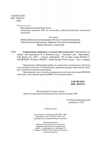 Библиографическое описание:Современные проблемы и методы биотехнологии : лаб. практикум [для студентов программы подг. 020400.68 «Биология»] / Сиб. федерал. ун-т ; сост. Н. А. Войнов [и др.]. - Электрон. текстовые дан. (PDF, 4,8 Мб). - Красноярск : СФУ, 2013. - (Магистратура). - Загл. с титул. экрана. - Библиогр.: с. 102-105. - Изд. № 2013-1241 : Б. ц. - Текст : электронный.
